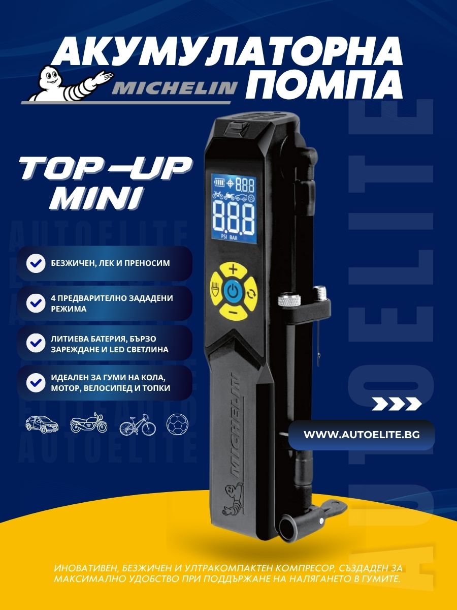 Акумулаторна помпа Michelin Top-Up Mini Rechargeable Inflator – Преносима, Дигитална, за Гуми и Топки | AutoElite.bg