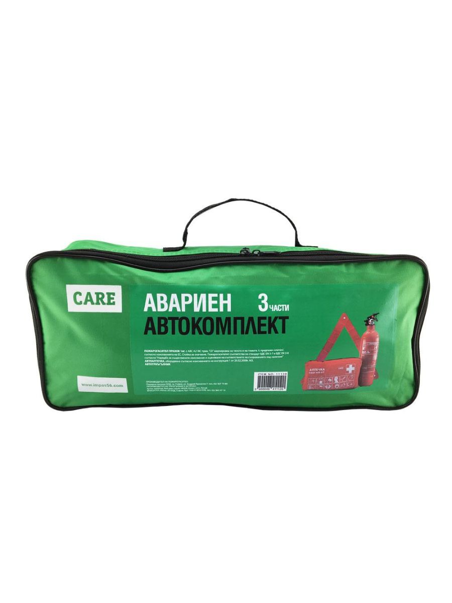 Авариен автокомплект CARE 3 в 1 предоставя основните и задължителни средства за безопасност на пътя. Включва прахов пожарогасител 1 кг с АВС прах, снабден с предпазен клапан и маркировка „СЕ“ на тялото и главата. Продуктът отговаря на всички европейски стандарти (БДС EN 3-7 и EN 3-8) и се доставя с метална стойка за лесен монтаж в автомобила.