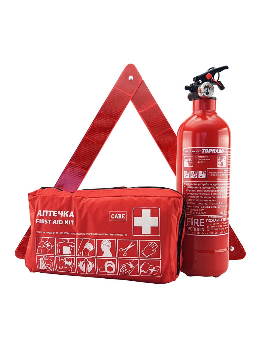 Авариен Автокомплект CARE 3 в 1 – Пожарогасител, Аптечка и Триъгълник за Пътна Сигурност