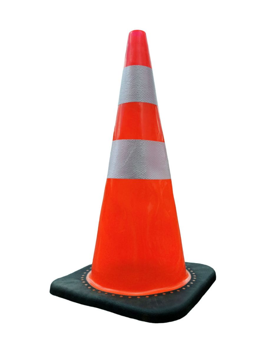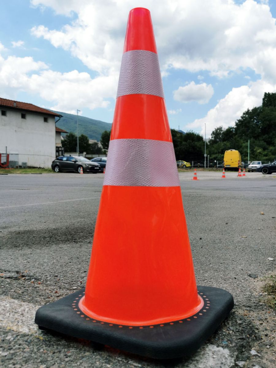 Конусът е изработен от високоустойчива PVC пластмаса, устойчива на деформации и климатични условия. Тежката гумирана основа осигурява отлична стабилност дори при силен вятър или преминаващи превозни средства. Яркооранжевото тяло и широките светлоотразителни ленти гарантират отлична видимост както през деня, така и при нощни условия. Съвместим с изискванията за пътна безопасност.