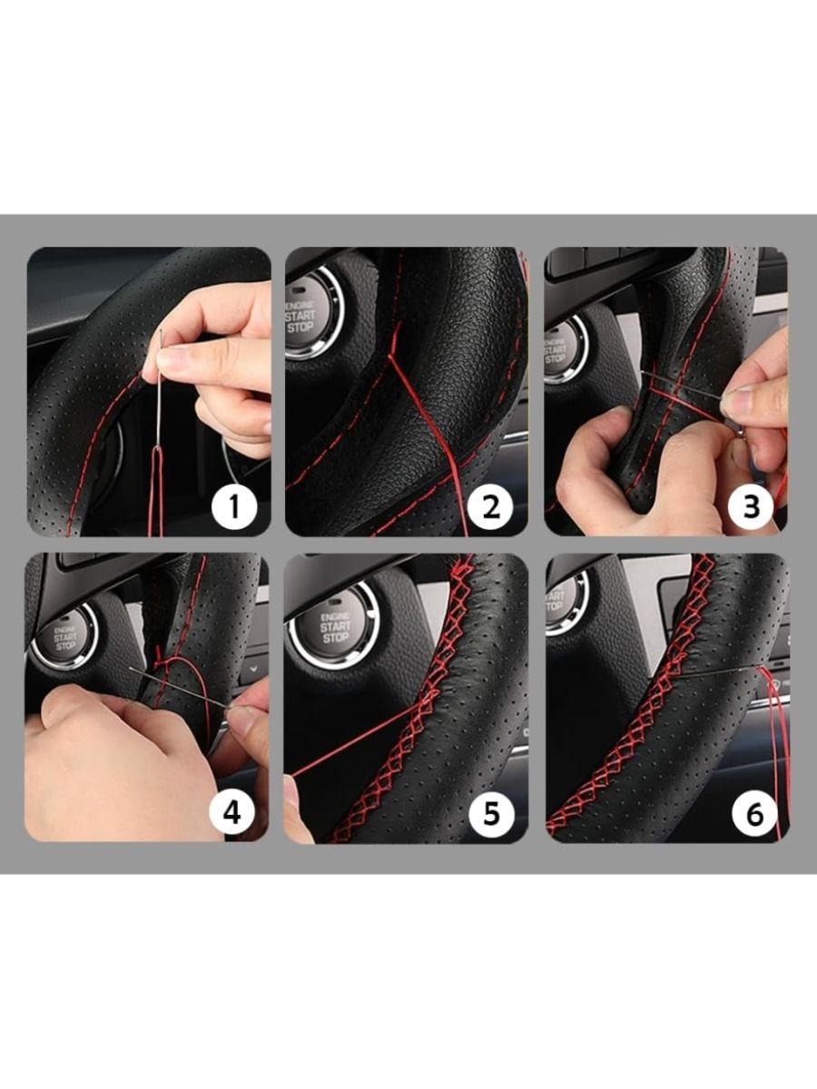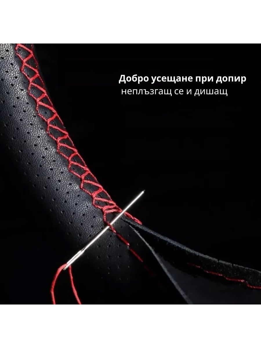 Ръчното пришиване осигурява прецизно прилягане, като елиминира вероятността калъфът да се хлъзга или усуква. Визуално контрастният червен шев създава спортно усещане, което подчертава стила на интериора. Размерът M е проектиран специално за волани с диаметър 37–38 см, което покрива широк кръг от модели автомобили – както градски, така и спортни.