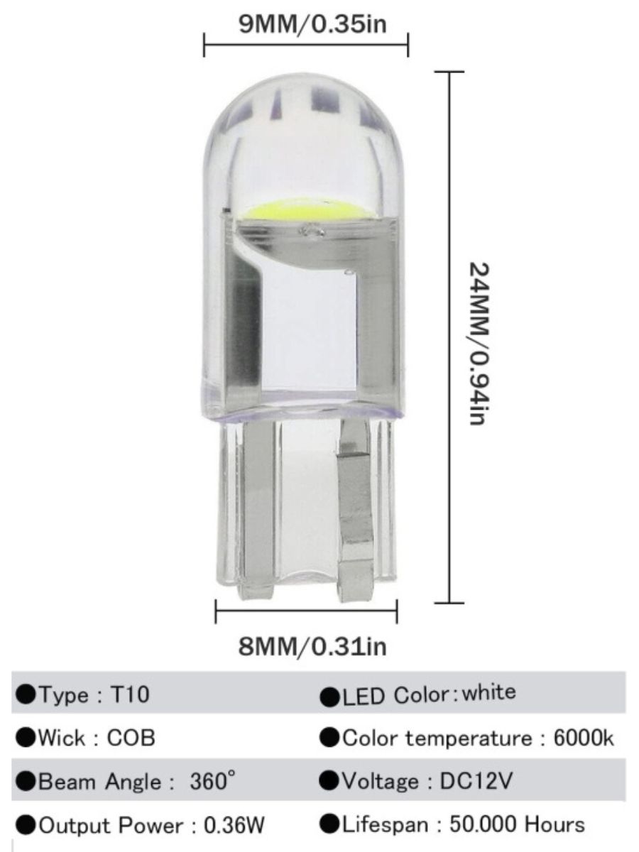LED крушките T10 W5W са съвместими с множество приложения – от габаритни светлини и осветление на регистрационния номер, до осветление в купето, жабката, багажника и други. Те са идеален избор за шофьори, които търсят модерна визия, ефективност и сигурност на пътя. Всяка крушка е компактна, с размери 24мм x 9мм, което позволява монтаж дори в тесни и труднодостъпни фарови или интериорни отделения.