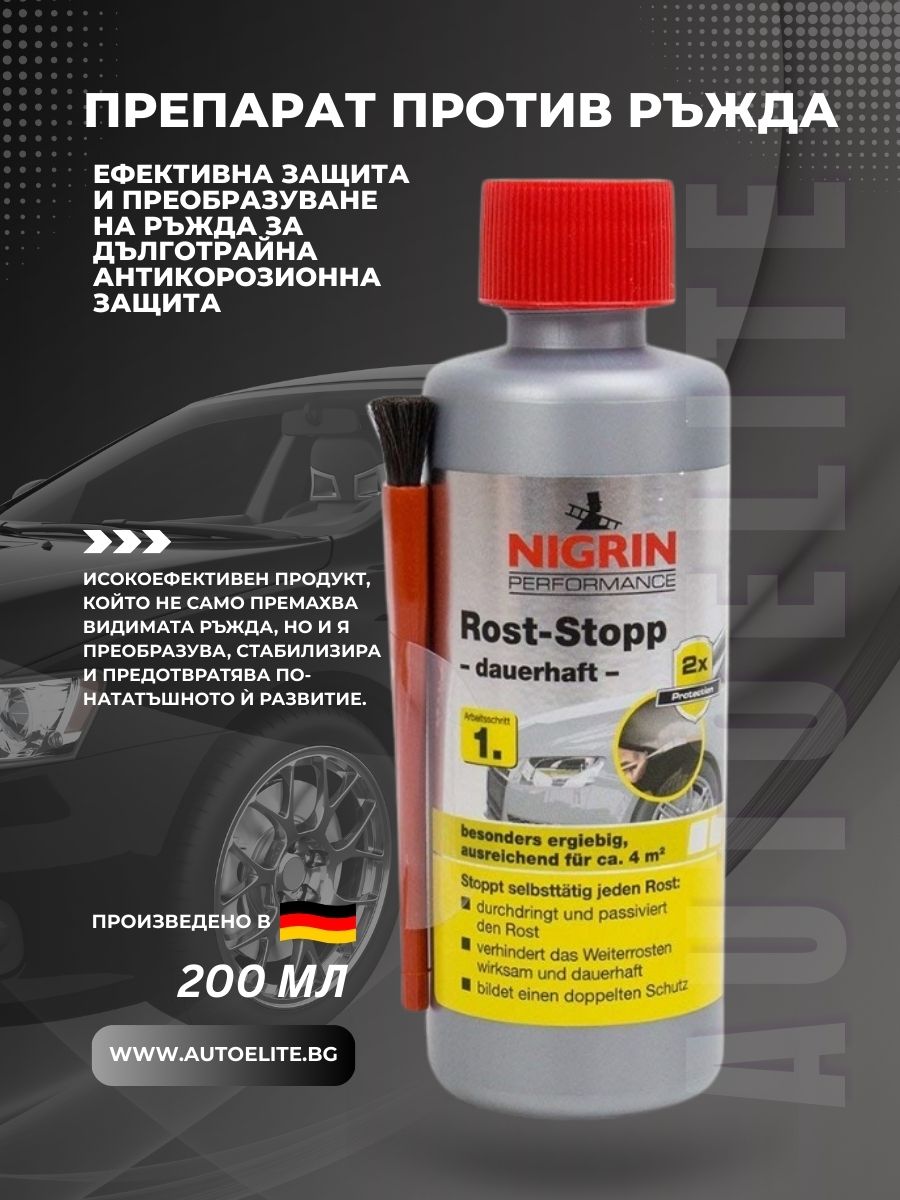 NIGRIN Електрохимичен препарат против ръжда може да бъде закупен лесно и удобно от AutoElite.bg, където ще откриете широка гама от висококачествени продукти за защита и поддръжка на вашия автомобил. AutoElite.bg е вашият надежден партньор в грижата за автомобила.