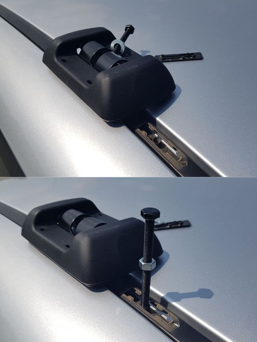 1.Позиционирайте гредите спрямо отворите на покрива. Използвайте включените винтове (6 мм или 8 мм според автомобила) и гайките, за да фиксирате гредите към тавана.