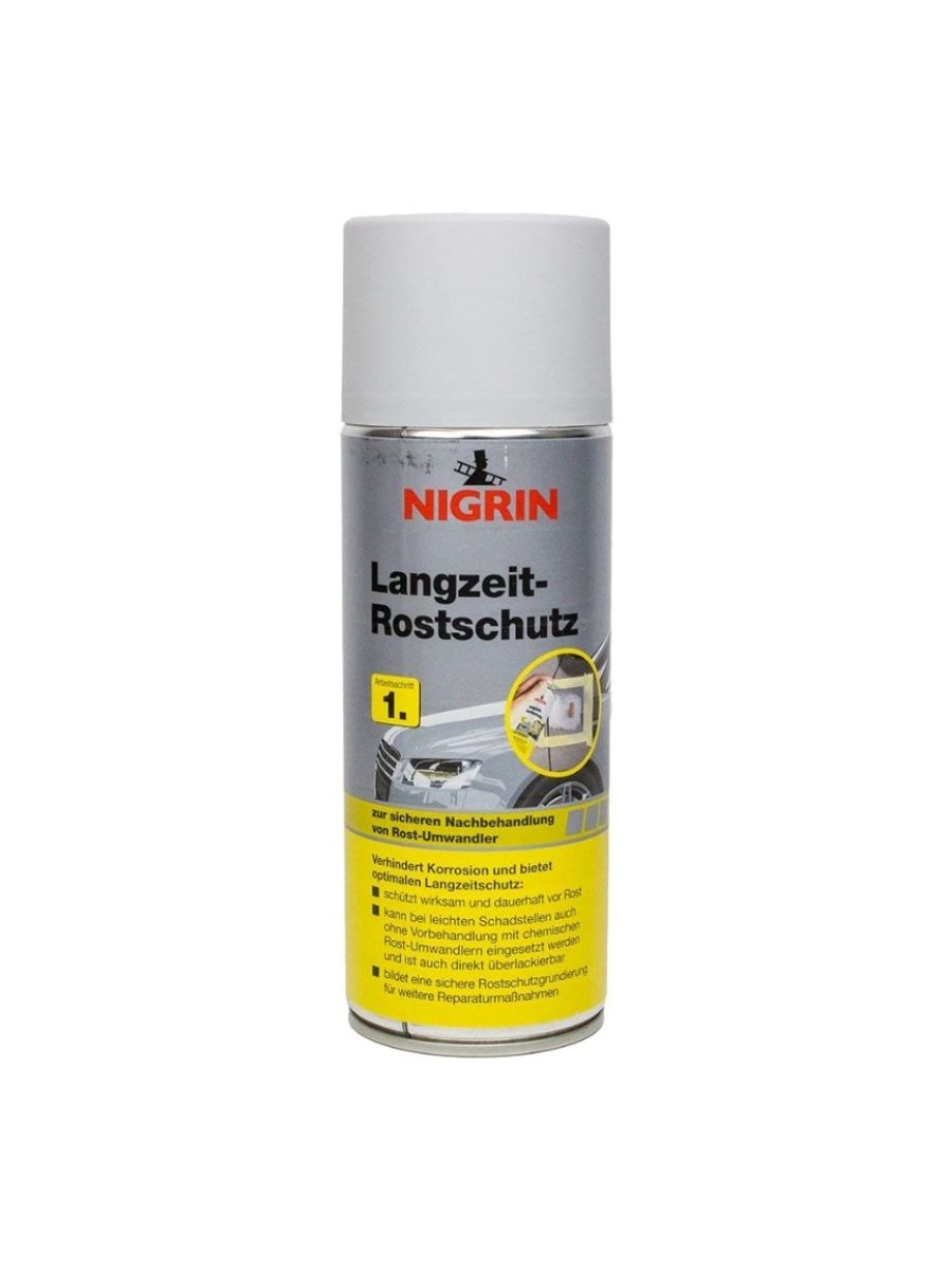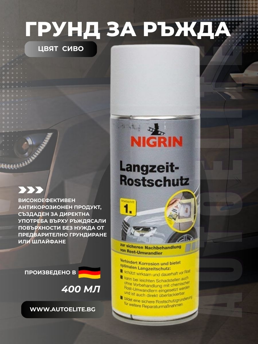 NIGRIN Грунд за ръжда 400 мл е високоефективен антикорозионен продукт, създаден за директна употреба върху ръждясали повърхности без нужда от предварително грундиране или шлайфане. Идеален е за обработка на метални елементи по автомобили, машини, инструменти и други обекти, изложени на корозия. Цветът на грунда е сив, което го прави подходяща основа за последващо боядисване