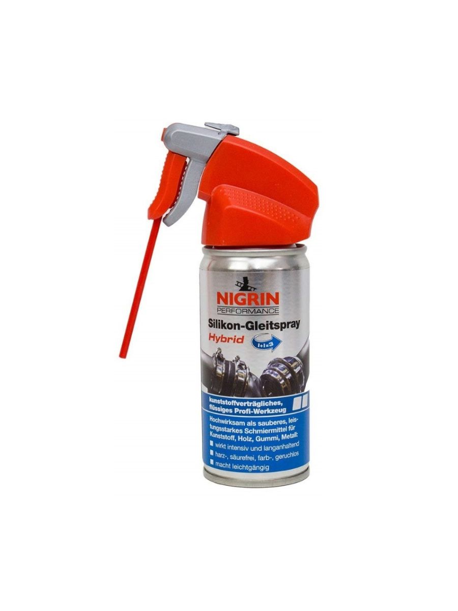 NIGRIN хибриден силиконов спрей 100 мл е висококачествен продукт за смазване, поддръжка и дълготрайна защита на пластмасови, гумени и метални повърхности.
