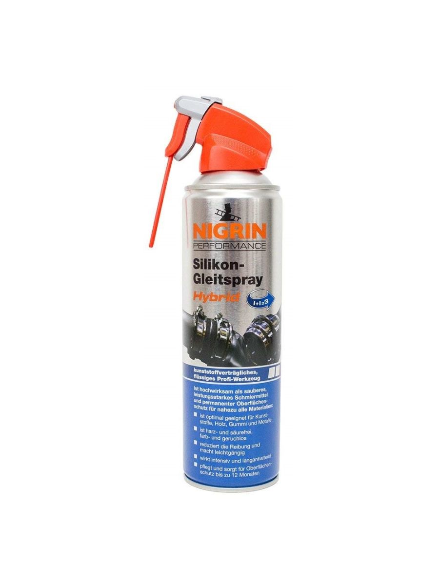 NIGRIN хибриден силиконов спрей 500 мл е универсално техническо средство, предназначено за смазване, поддръжка и защита на чувствителни повърхности, като пластмаса, гума и метал.