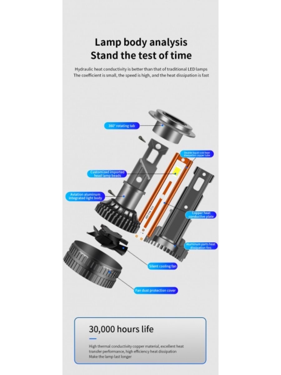 С вградена вакуумна медна охлаждаща тръба, системата осигурява до 200 пъти по-ефективно охлаждане в сравнение с традиционните лед крушки. Това гарантира дълготрайна и стабилна работа при всякакви климатични условия. Интегрираната конструкция, комбинирана с вграден Canbus драйвер, елиминира грешките на таблото и осигурява перфектна съвместимост с повечето модерни автомобили.