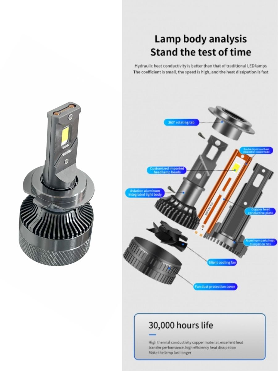 Комплектът включва две LED H7 Х7 крушки с комбинирана мощност от 200W и обща яркост от 17000 лумена. Тази светлина е достатъчно мощна, за да осигури по-широка и равномерна видимост на пътя, без да заслепява насрещните водачи. Студената бяла светлина от 6000K е близка до дневната и намалява умората на очите при дълги пътувания.