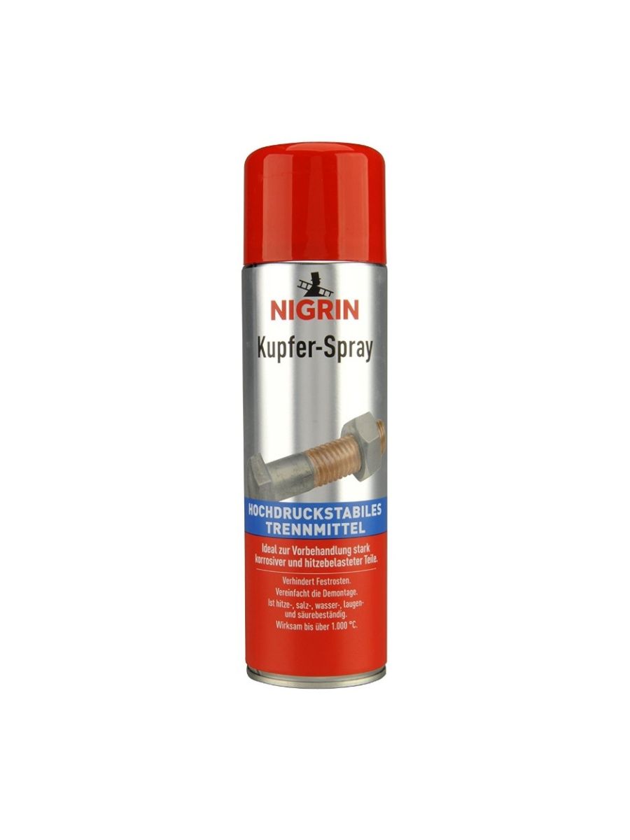 NIGRIN Меден спрей 500 мл е високоефективен смазочен продукт, създаден за дълготрайна защита на метални елементи, изложени на интензивно термично и механично натоварване. Съставен от фини частици мед, спреят образува устойчив, електропроводим и защитен филм, който издържа на температури до над +1100°C. Той е идеално решение за предварителна обработка на болтове, гайки, изпускателни системи, турбокомпресори, спирачни компоненти и други части, подложени на екстремни условия.