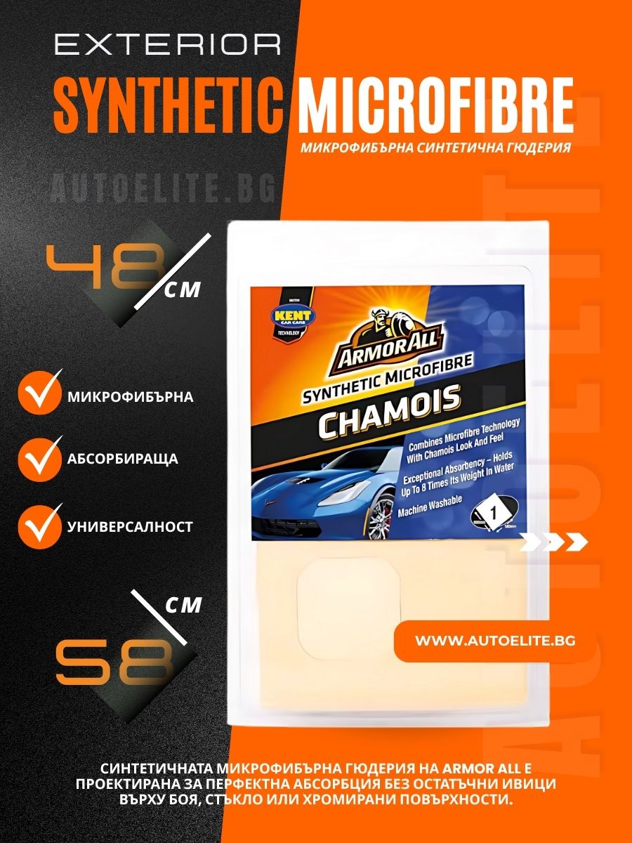 Постигнете професионален завършек при сушене на автомобила си с Armor All Synthetic Microfibre Chamois 48x58 cm. Тази микрофибърна синтетична гюдерия комбинира високотехнологични микрофибри с вида и усещането на естествена гюдерия, като предлага изключителна абсорбция и безупречно сушене без следи. Идеална за автомобили, прозорци и огледала, тя задържа до 8 пъти теглото си във вода. Поръчай сега от AutoElite.bg и улесни поддръжката на колата си!