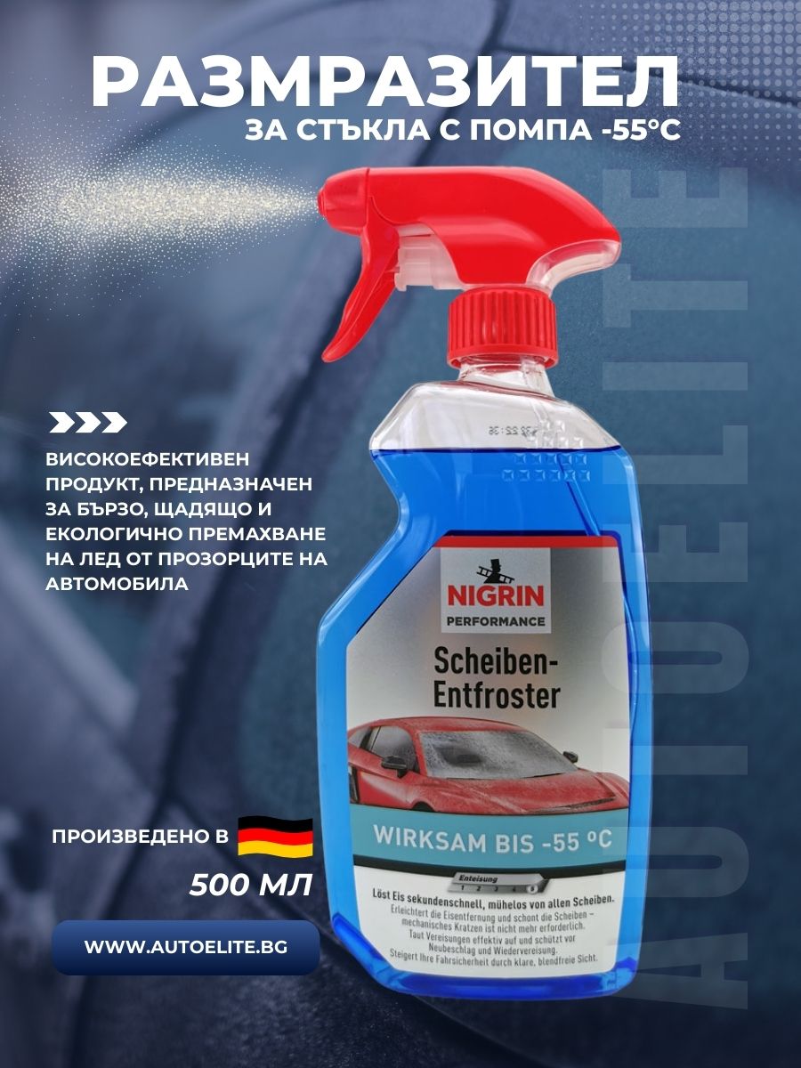 NIGRIN Размразител за стъкла с помпа -55°C е високоефективен продукт, предназначен за бързо, щадящо и екологично премахване на лед от прозорците на автомобила.