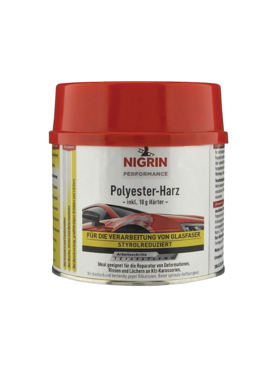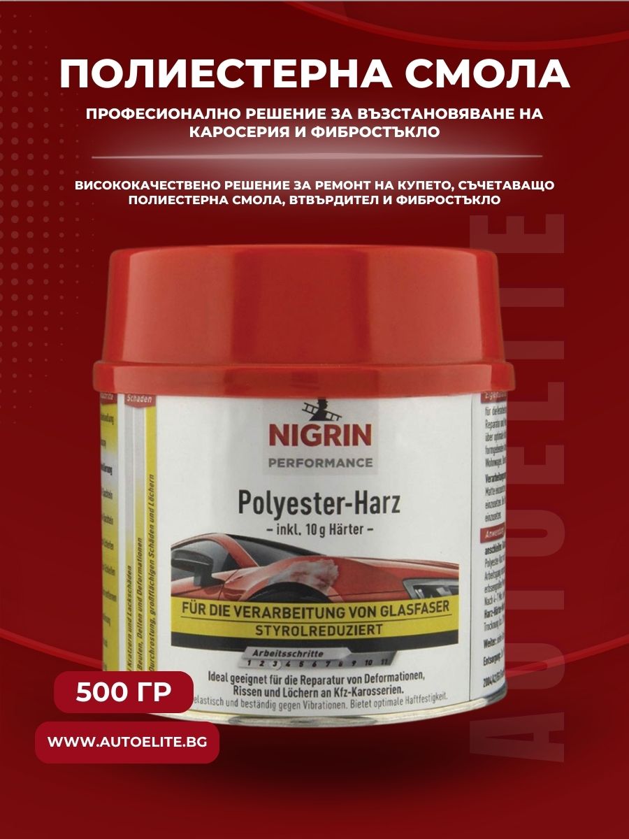 Полиестерната смола NIGRIN 500 гр е високоефективен двукомпонентен продукт, предназначен за трайни ремонти върху метални, пластмасови и фибростъклени повърхности. Идеална е за използване в комбинация с фибростъкло, като осигурява здрава, еластична и устойчива на вибрации връзка при поправка на пукнатини, деформации и дупки по купето на автомобила.