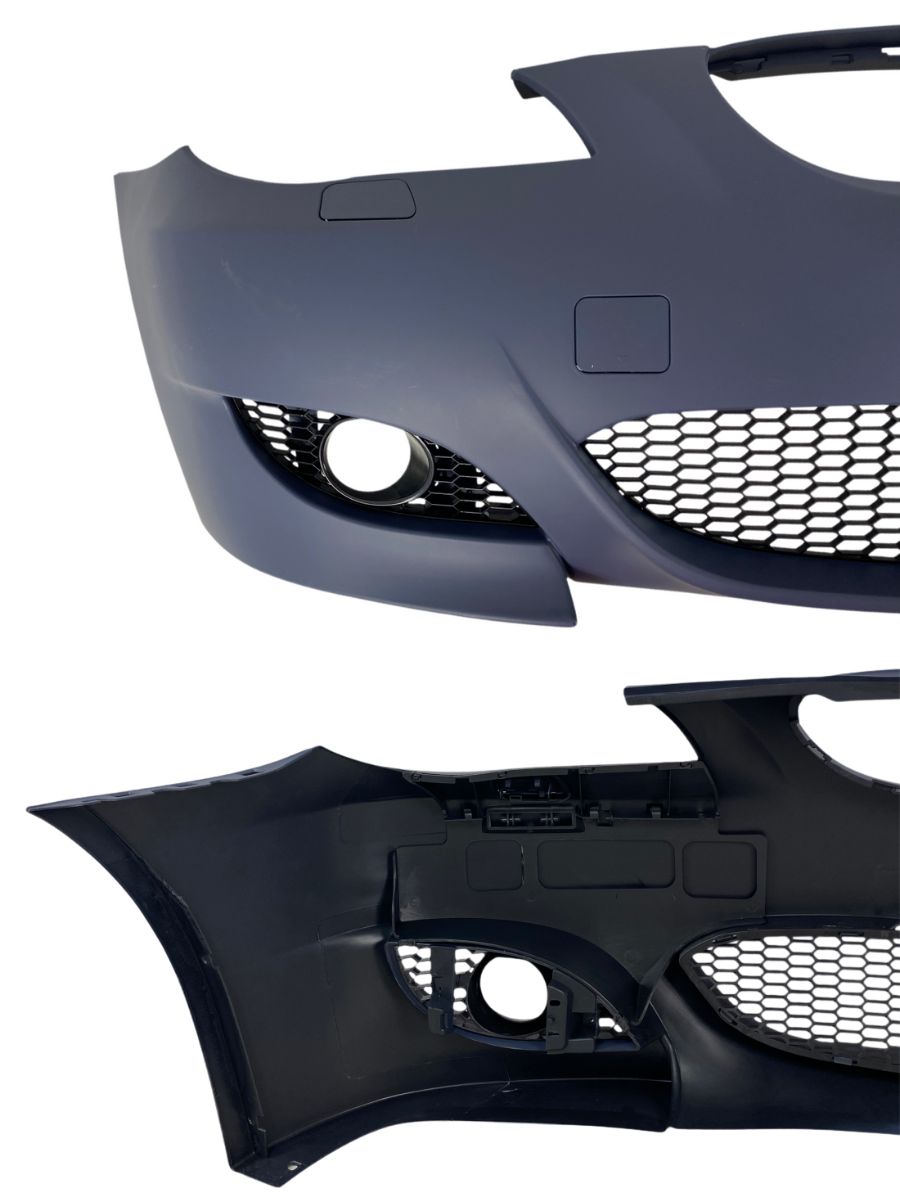 Предната броня с M5 дизайн е вдъхновена от динамичната визия на BMW M5 и е адаптирана за стандартните модели E60 и E61. Тя е оборудвана с фабрично оформени отвори за халогени и маркировки за парктроник сензори. Решетките, включени в комплекта, са оптимизирани за максимален въздушен поток и допринасят за охлаждането на двигателя, като същевременно запазват автентичния М стил.