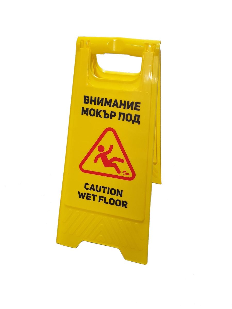 Предупредителната табела CARE „Мокър под“ е задължителен аксесоар за поддържане на безопасността в обществени и търговски обекти. Изработена от здрав и устойчив на удар жълт PVC материал, табелата се отличава с висока видимост и ясно послание. Надписът „Мокър под“ е отпечатан от двете страни на табелата, което позволява двупосочна сигнализация за преминаващи хора. Сгъваемият ѝ дизайн я прави изключително удобна за съхранение и бързо поставяне при нужда. Незаменима в хотели, ресторанти, търговски обекти, болници, училища, офиси и други обществени пространства, където е важно да се предупреди за рискове от подхлъзване след почистване или разлив.