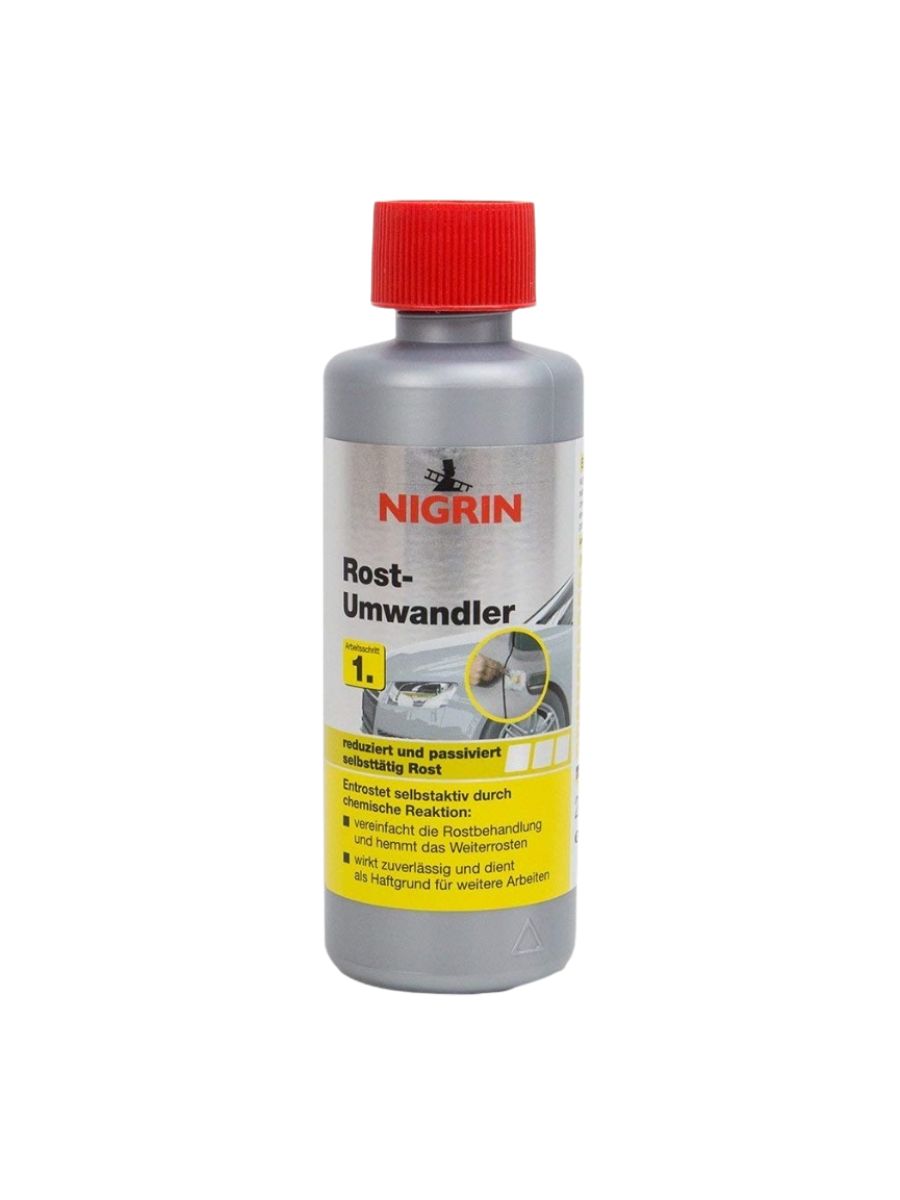 Преобразувателят на ръжда NIGRIN 200 мл е високоефективен продукт, създаден за професионално третиране и възстановяване на ръждясали метални повърхности. Неговата иновативна химическа формула прониква в структурата на ръждата и я трансформира в стабилно, черно съединение, което спира корозионния процес и създава основа за последващо боядисване. Това прави продукта идеален за използване при реставрация и поддръжка на автомобили, машини, инструменти и метални конструкции