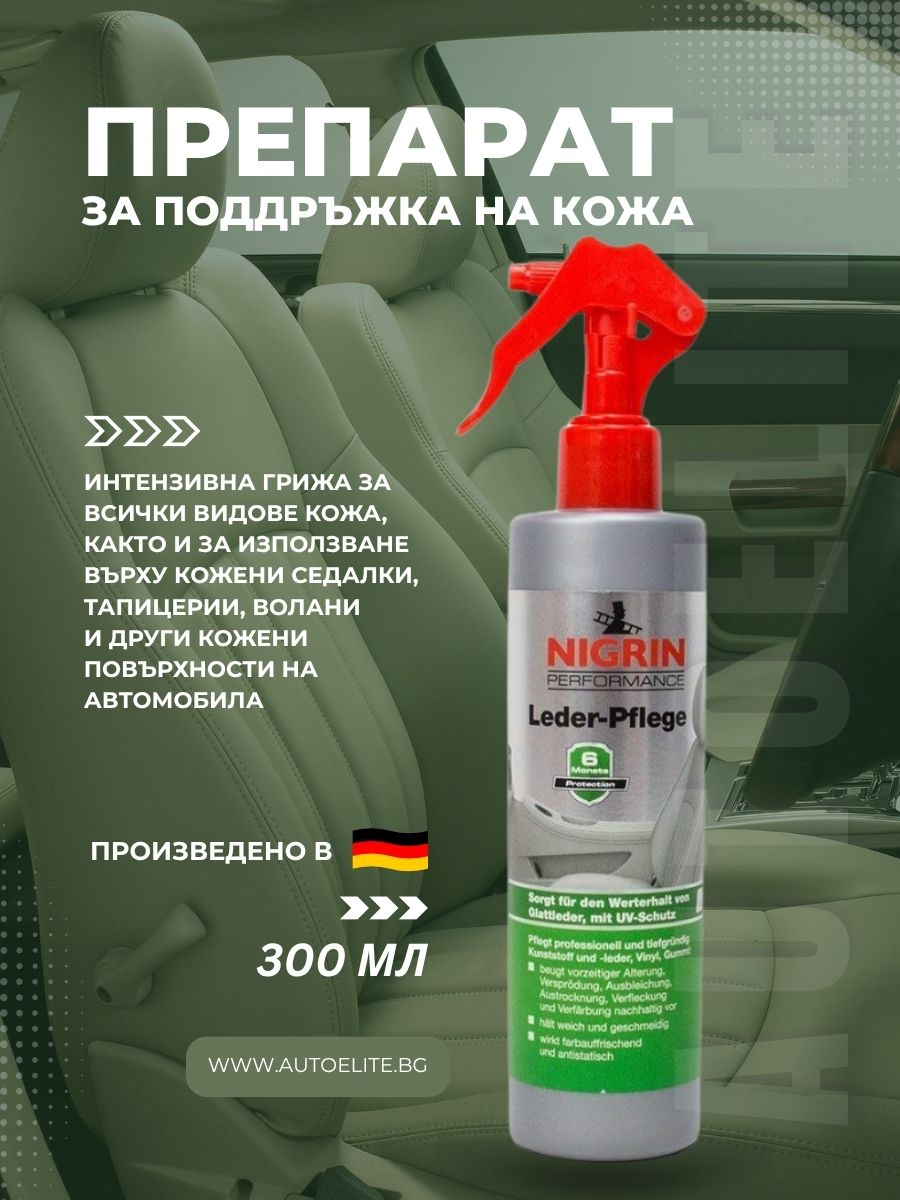 Препаратът за поддръжка на кожа NIGRIN 300 мл можете да закупите от AutoElite.bg – надежден онлайн магазин за автомобилни аксесоари и автохимия. В AutoElite.bg ще откриете всичко необходимо за грижата за вашия автомобил и ще получите качествени продукти с бърза доставка.