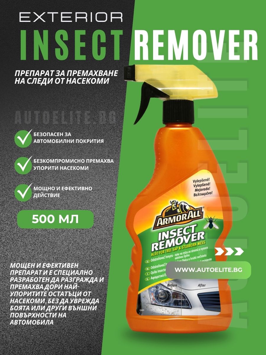 Кажете "стоп" на досадните следи от насекоми с Armor All Insect Remover! Поръчайте сега от AutoElite.bg и се насладете на безупречно чист автомобил без усилие!