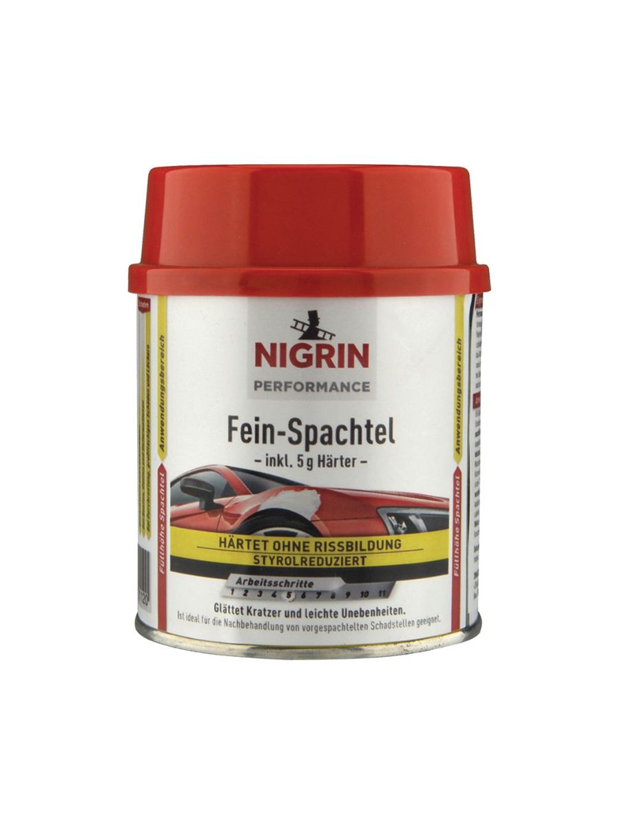 NIGRIN Препарат за запълване – фин 250 гр е висококачествен полиестерен кит, предназначен за финална обработка при ремонт на автомобилната каросерия.