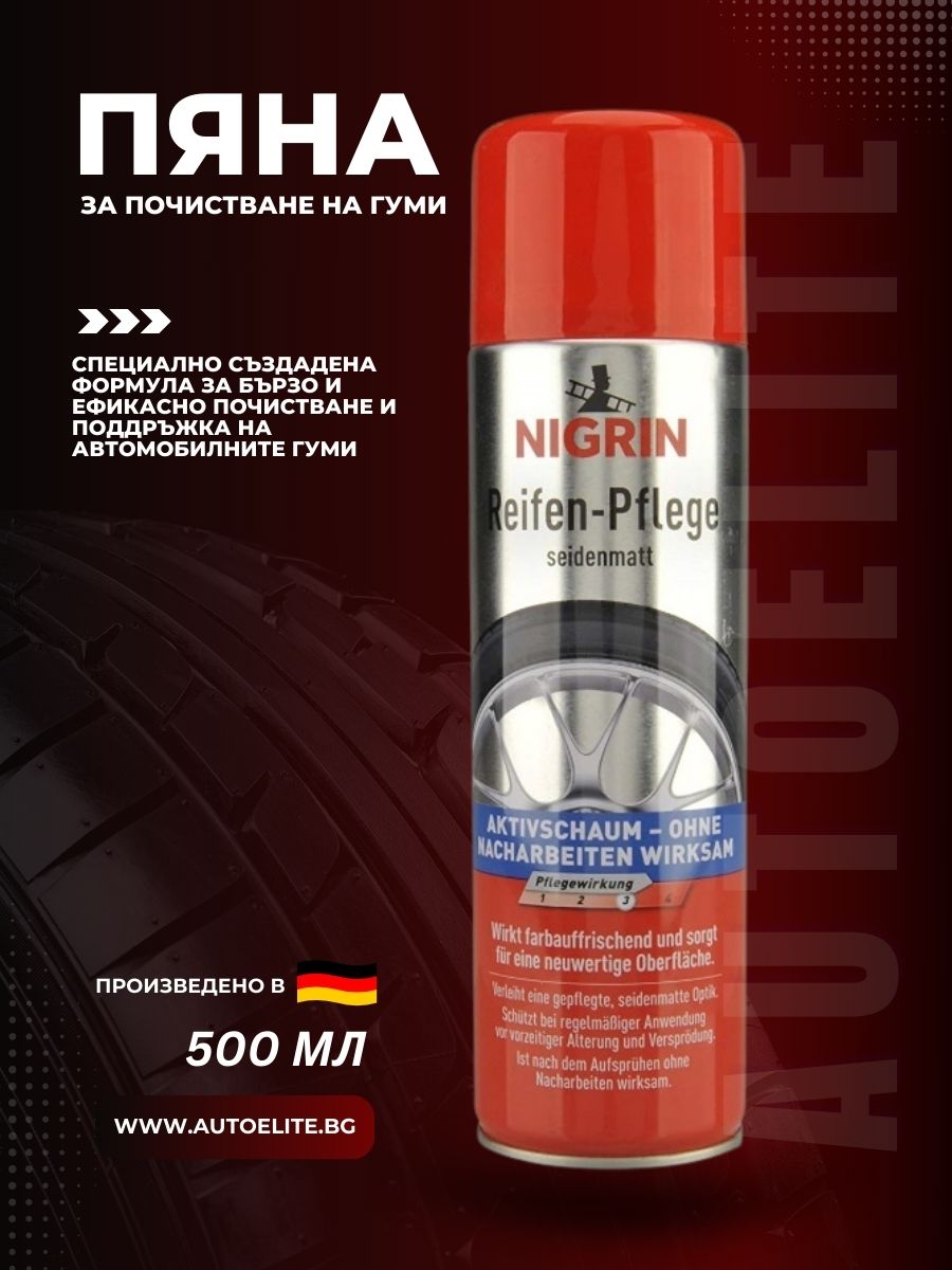 NIGRIN Пяна за почистване на гуми 500 мл е специално създадена формула за бързо и ефикасно почистване и поддръжка на автомобилните гуми.