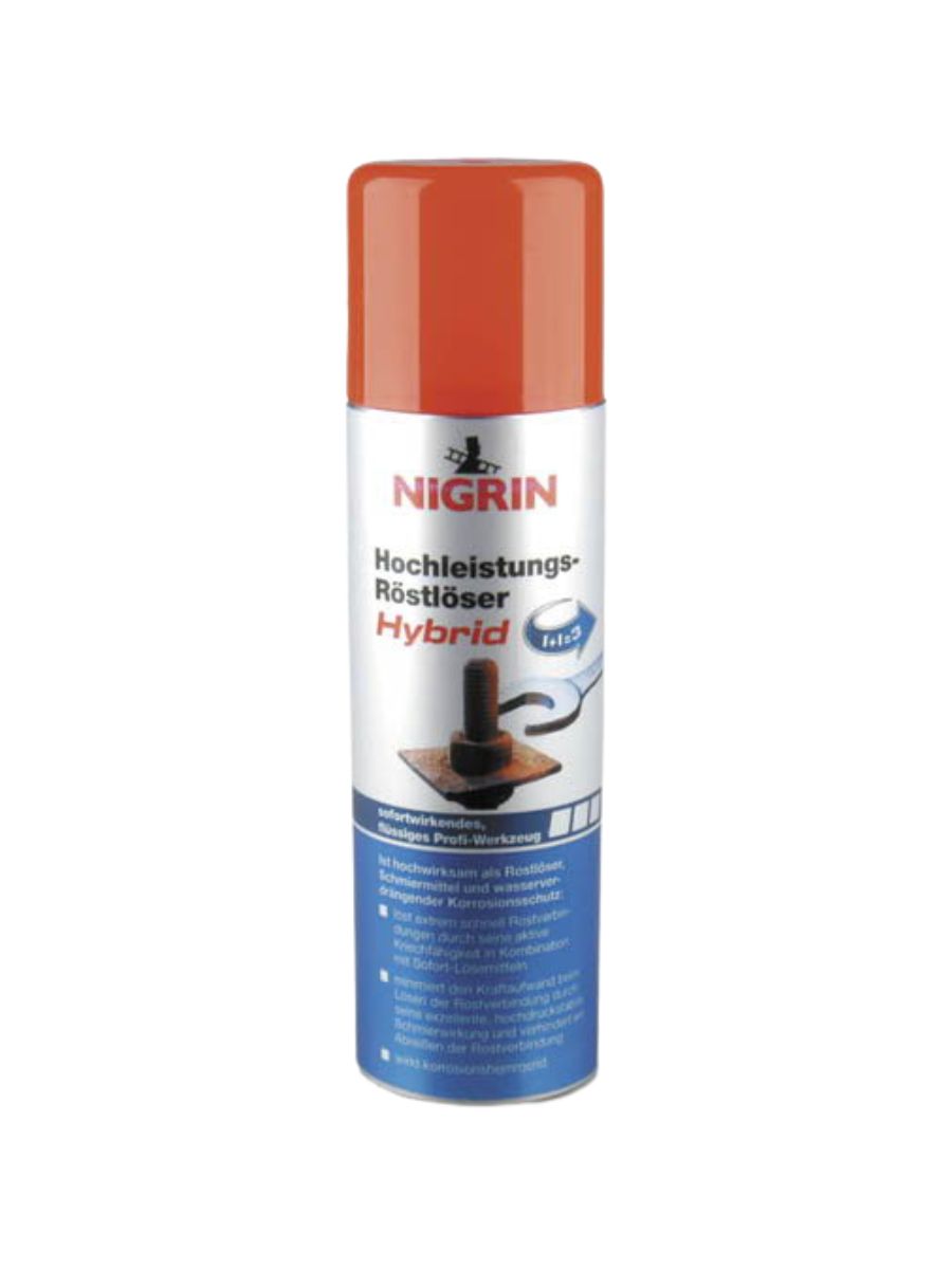 Разтворителят за ръжда NIGRIN в удобна разфасовка от 250 мл е високоефективен продукт, предназначен за бързо и безопасно отстраняване на корозия от болтове, гайки, панти и други метални елементи. Формулата му прониква в дълбочина, разтваря ръждата и улеснява демонтажа на захванати или блокирани части без нужда от усилие. Благодарение на своята смазваща функция и способност да отблъсква влагата, продуктът не само разхлабва, но и предотвратява повторно образуване на корозия. Особено важно предимство е, че е неутрален към автомобилната боя, което го прави идеален за използване при ремонти и поддръжка на превозни средства, без риск от увреждане на лакови покрития.