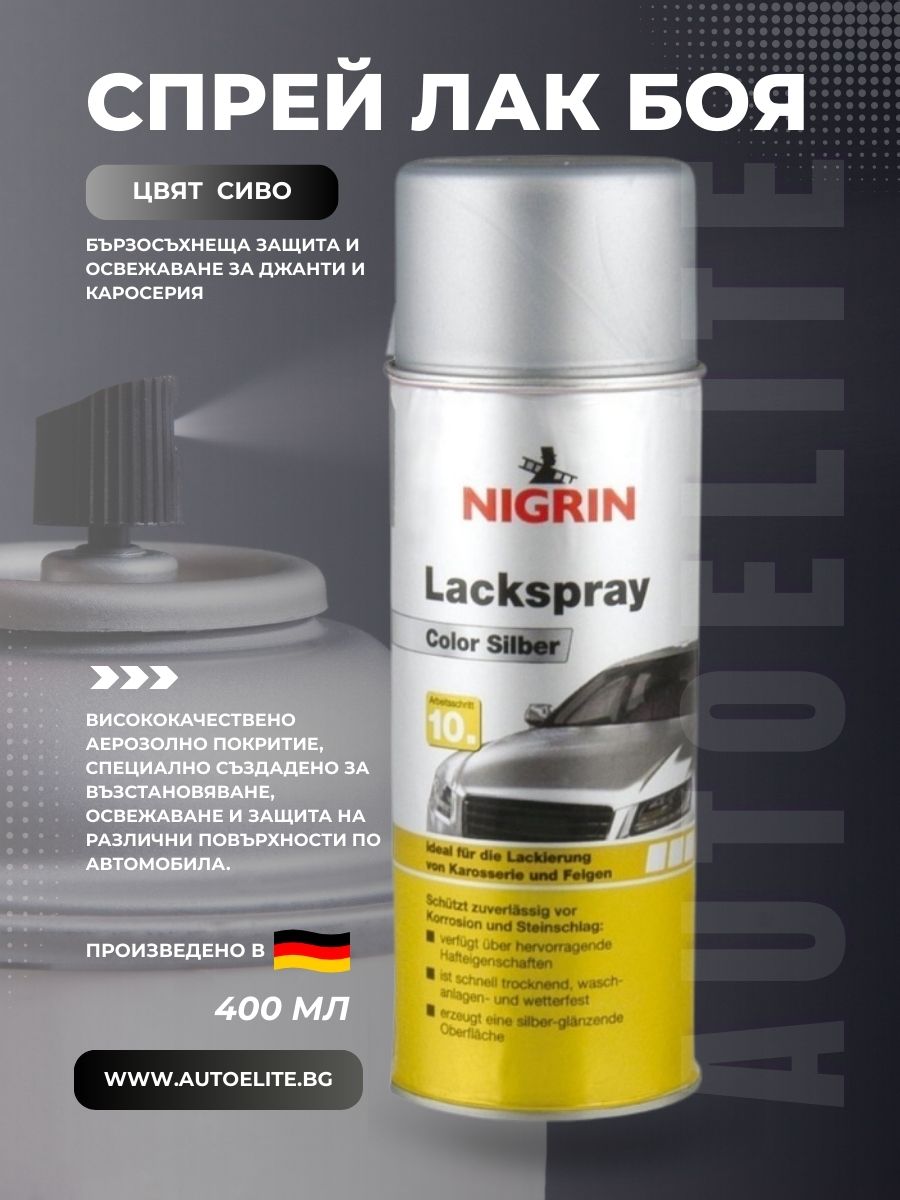 NIGRIN Спрей лак боя – сива 400 мл е висококачествено аерозолно покритие, специално създадено за възстановяване, освежаване и защита на различни повърхности по автомобила.