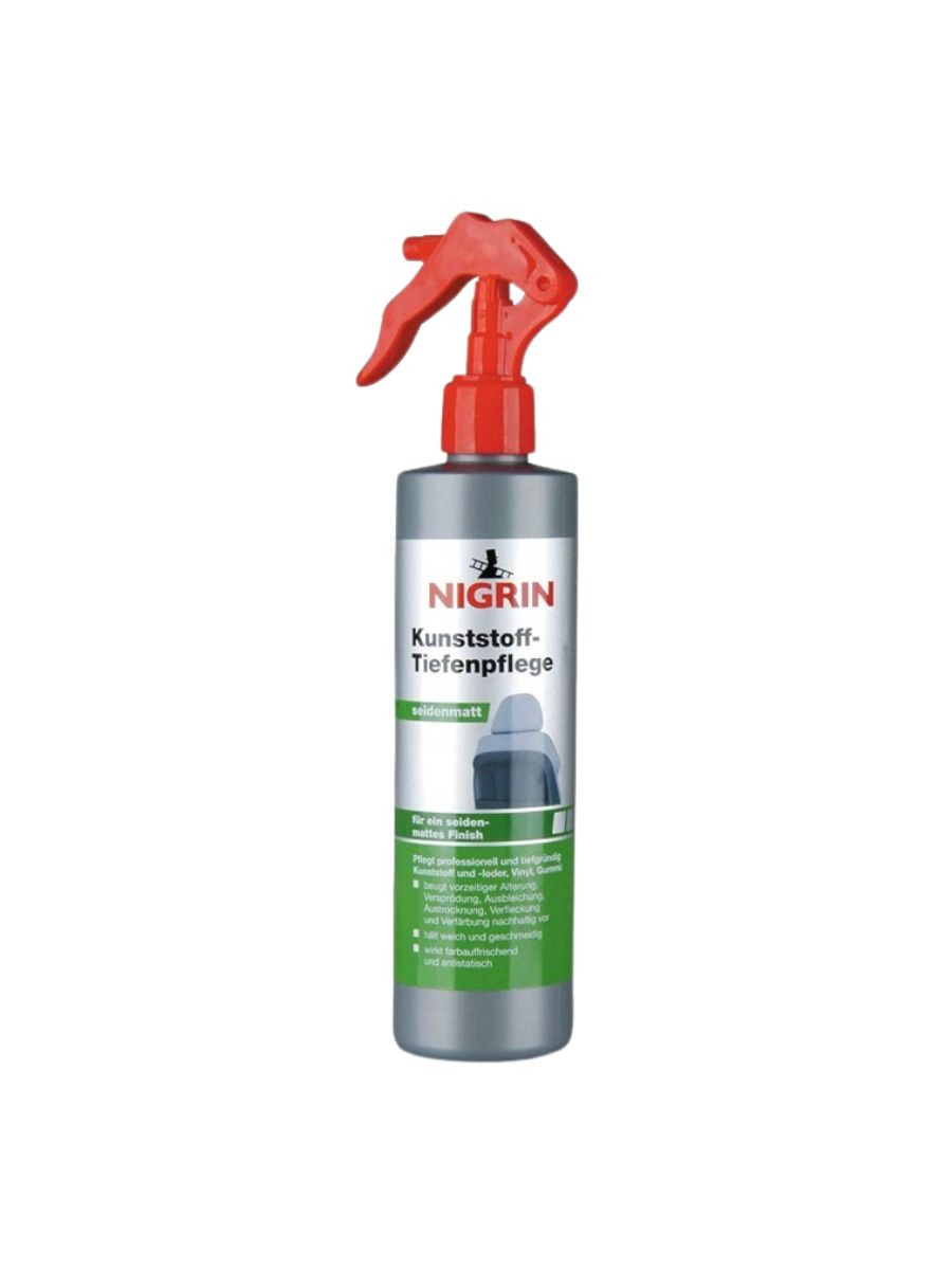 Формулата на NIGRIN е специално разработена, за да бъде щадяща към повърхностите и в същото време изключително ефективна, като съхранява дълготрайно добрия външен вид на пластмасовите части. Подходящ е както за черни, така и за цветни пластмаси и може да се използва и върху външни пластмасови елементи като брони и лайсни.
