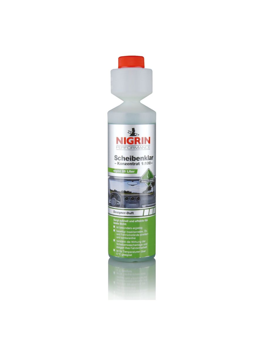 NIGRIN Течност за чистачки 1:100 – 250 мл е високоефективен концентрат за стъкломиячна система, който осигурява кристално чисти предни и задни стъкла, както и фарове, без да оставя следи, петна или отблясъци