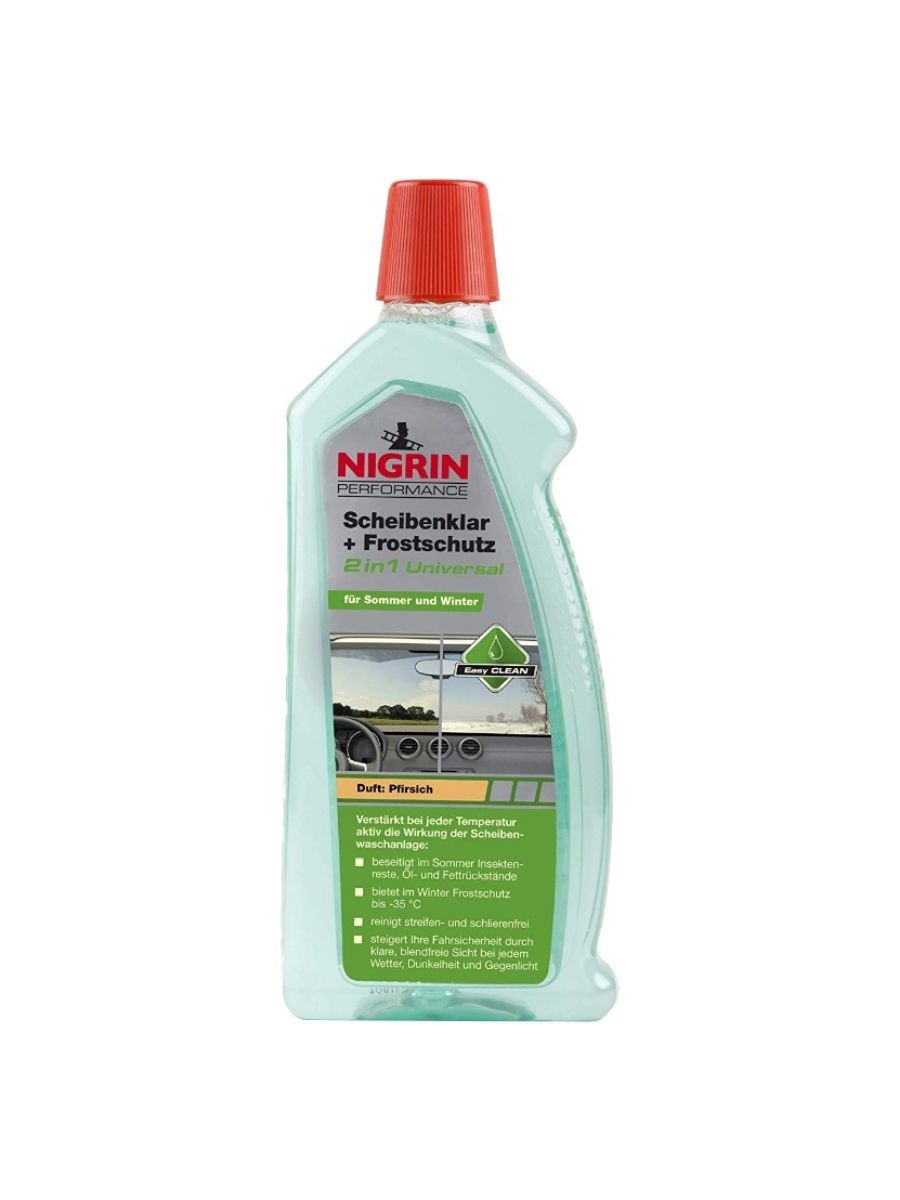 NIGRIN 2 в 1 универсален препарат 1000 мл съчетава ефективността на висококачествена течност за чистачки с мощната почистваща сила на препарат за стъкла. Този многофункционален продукт е създаден за целогодишна употреба и осигурява безупречна видимост и безопасност при шофиране, като едновременно поддържа автомобилните стъкла идеално чисти и без следи.