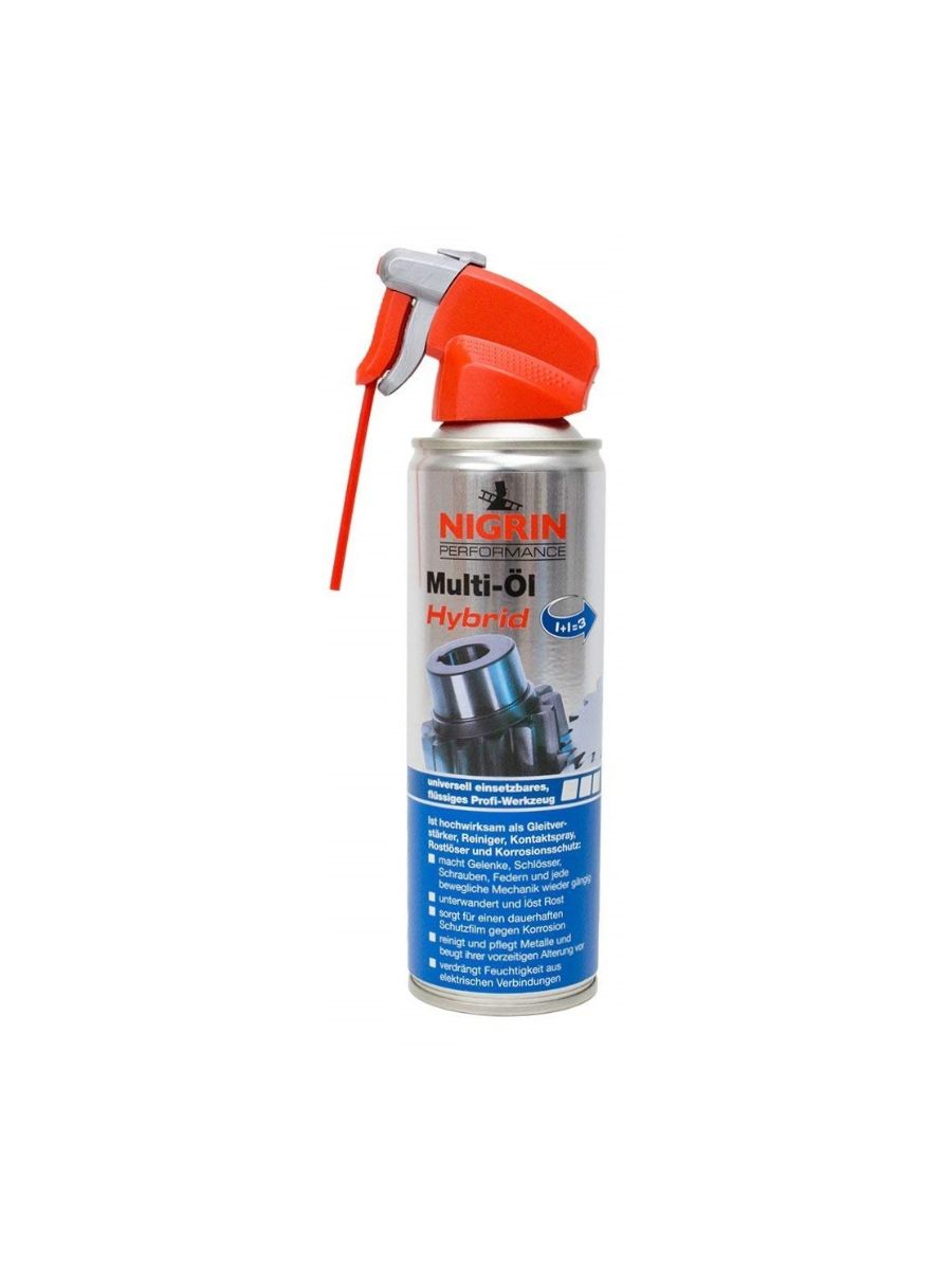 NIGRIN хибридна универсална смазка в спрей форма (250 мл) е иновативен продукт, предназначен за смазване, защита и поддръжка на подвижни метални части в автомобила, дома, работилницата и градината.
