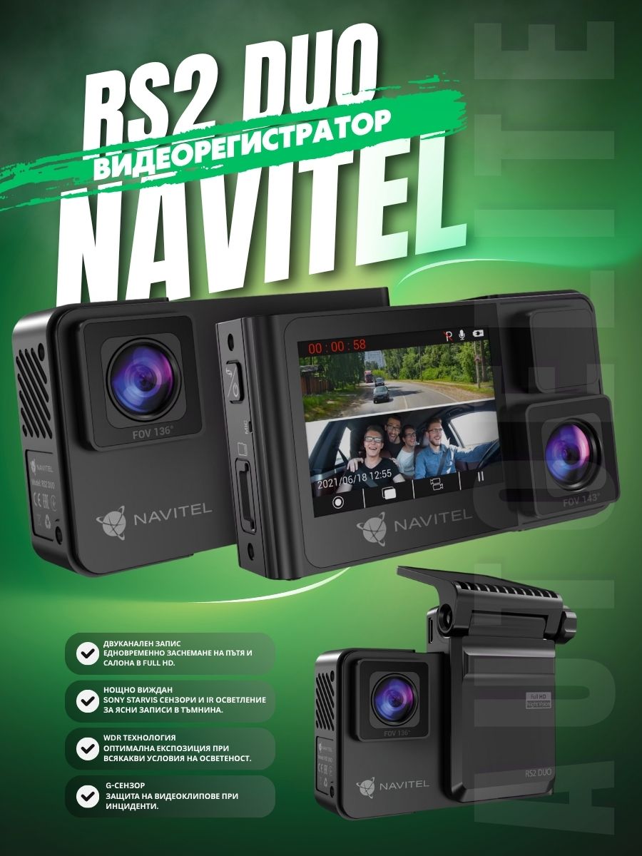 Navitel RS2 DUO – модерен, двуканален видеорегистратор, създаден да предложи пълна защита и спокойствие както на пътя, така и в интериора на вашето превозно средство.